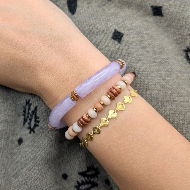 Bracelet perles en acétate couleur lilas, hématites dorées et pierres de sable doré, monté sur cordon élastique.